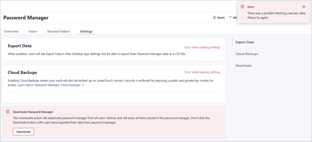 When an Admin is setting up JumpCloud Password Manager for a new tenant, they may encounter the following error message in Settings.