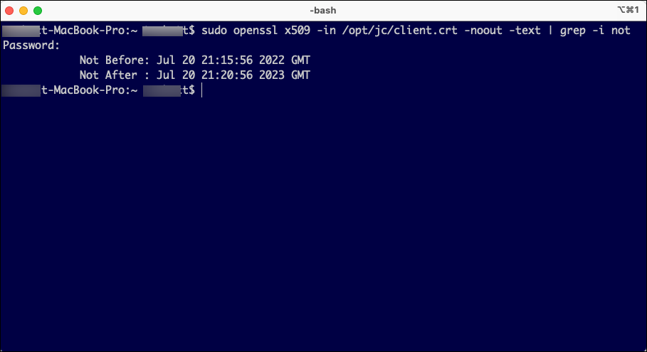 sudo openssl x509 -in /opt/jc/client.crt -noout -text | grep -i not - Windows: