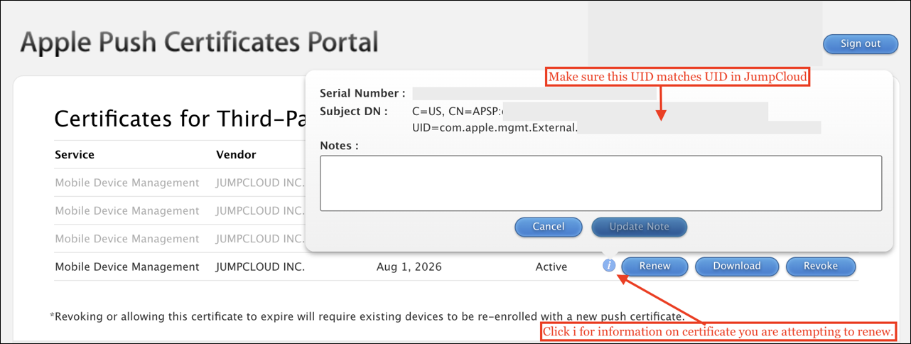 To resolve the error, verify the Certificate UID in both the JumpCloud Admin Portal and the Apple APNS Portal are the same. If Certificate UIDs don't match, you will need to transfer the certificate through Apple.