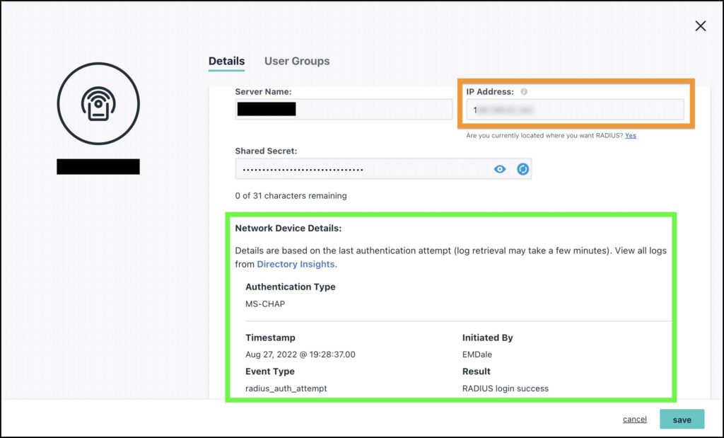 You can also verify these results in both the Directory Insights portal and the RADIUS section of your Admin Portal by navigating to Details > Network Device Details of your JumpCloud endpoint.