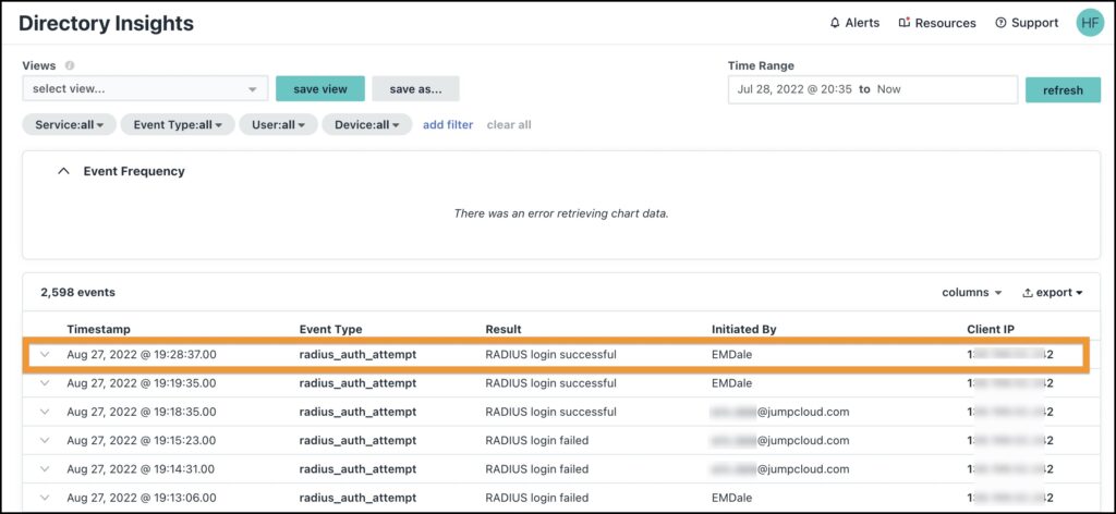 Failed Directory Insights events are generated anytime RADIUS authentication fails. This may occur when an employee attempts to authenticate with invalid credentials, or it may also indicate potential threat actor attempts.
