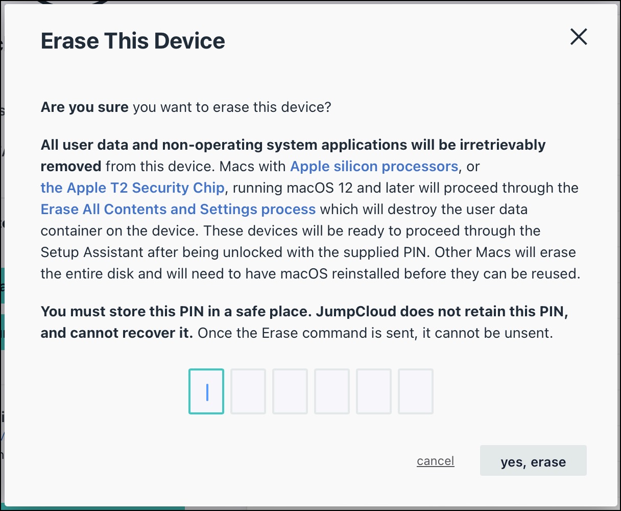 - JumpCloud doesn't retain the PIN used to erase macOS devices and cannot recover it. It is critical that you record the PIN used to erase the macOS device. If you don't have the PIN, you won't be able to unlock the device and will need to contact Apple for service to unlock it.