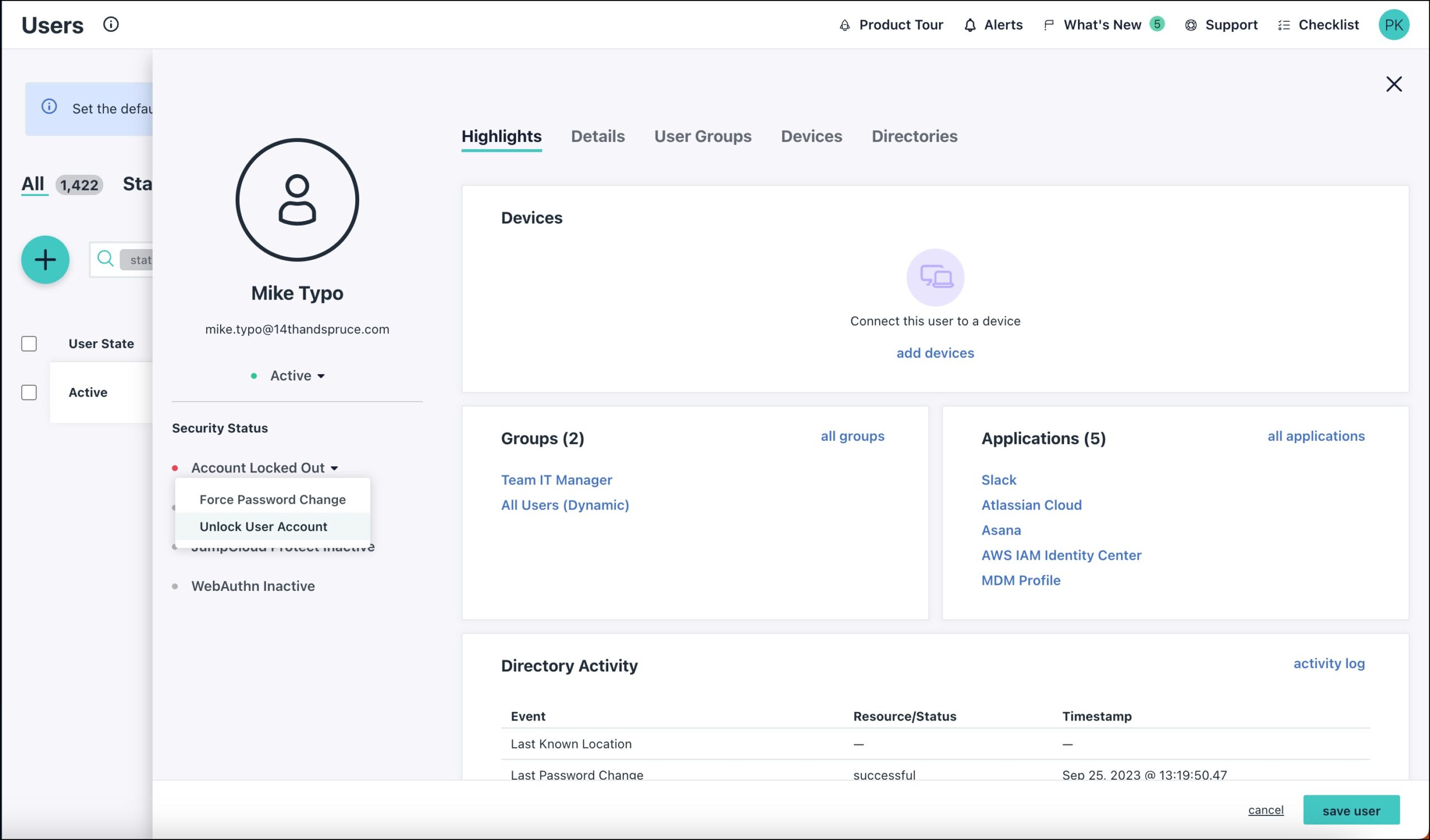 You can unlock a single user from the User panel or multiple users from the Actions menu on the Users list. When you unlock a user account that is locked due to failed login attempts, the accumulated failed login attempts are cleared and users regain access to their account. Be aware that unlocking a user account doesn’t automatically reset their password. If users don’t remember their account password, they need to have their password reset. See Reset Passwords to learn more.