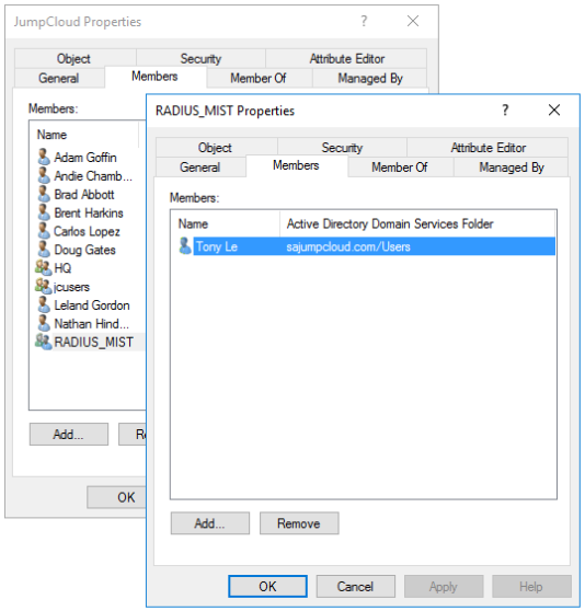 You can create users in Active Directory Domain Services (AD-DS) and use the JumpCloud AD Import Agent to sync them to JumpCloud RADIUS. For example, the following screenshot displays a user and group in AD-DS: