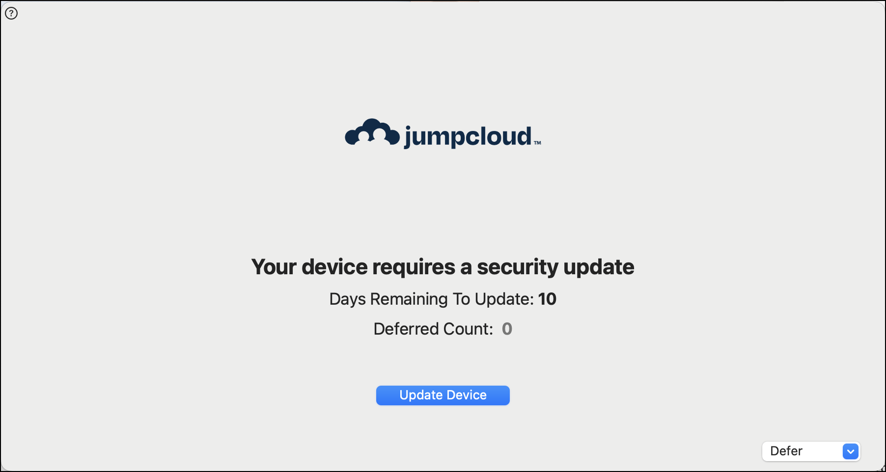 JumpCloud offers automatic OS patch management to help keep your macOS 11 Big Sur and later devices updated and secure. If your IT Admin created an Automatic MacOS Updates policy to enforce minor updates for your device, the deferral and grace period are controlled by that policy.