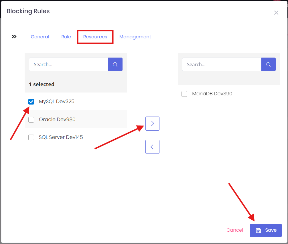 - In the Resources tab, select which resources the rule will apply to. The left-hand list shows all available resources to apply a rule. From this list, select the resources you want and use the right arrow to move them to right to the assigned list.