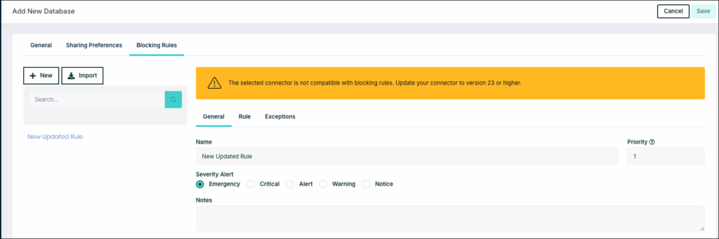 - Go to Databases > Blocking Rules and click Create.