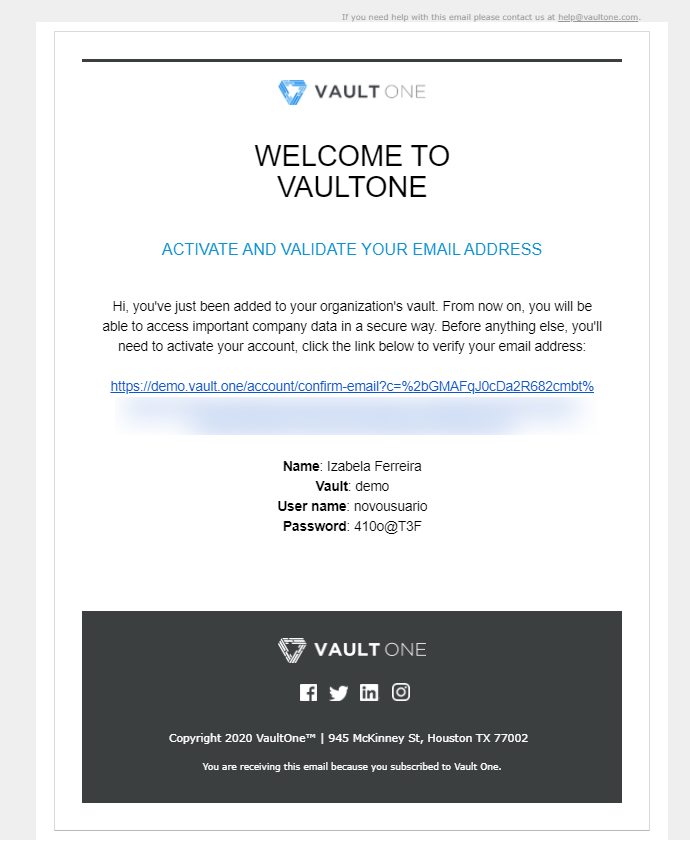 When a new user account is created in Vault, that user will receive an email to activate their account and set up their initial access.