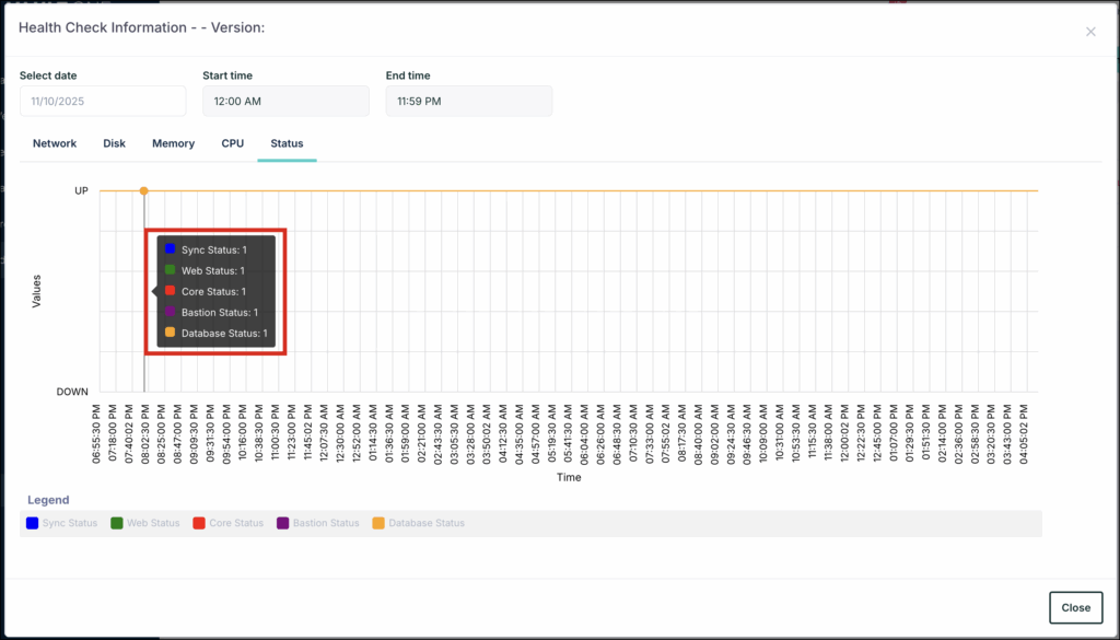 - On the Health Check Information page, select the Status tab to view the connector's operational status. A status value of 1 indicates the connector is working as expected, while 0 indicates it is down.