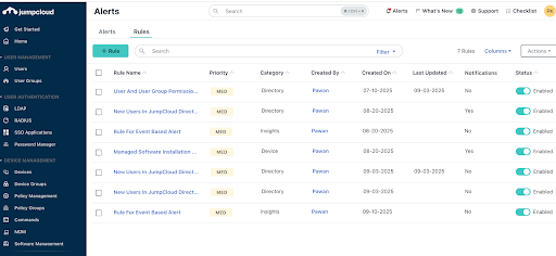 In a remote-work world, it's challenging for admins to gain visibility over their IT in real time. JumpCloud Alerting and Monitoring enables IT admins and MSPs to monitor their distributed IT environments in real time to identify and fix crucial deviations before they become major issues. Enhance operational efficiency, provide timely support to end-users, minimize system downtime, and reduce security risks with comprehensive visibility over your IT infrastructure.